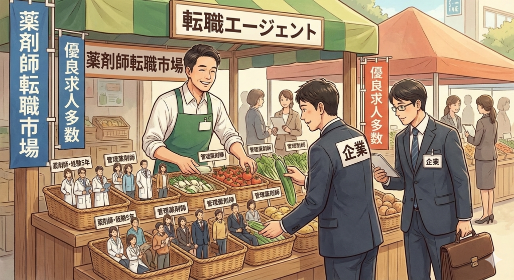 (上記のイラストはAIに生成してもらった”転職市場を市場に例えてイラスト化してください”というものです。)