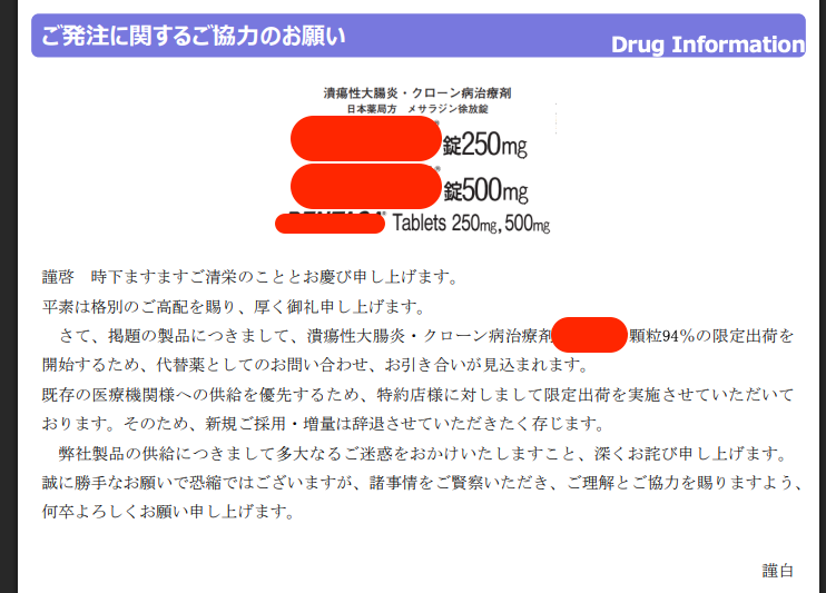 この製剤が手に入らないかもしれません。流通状況を加味しまして潰瘍性大腸炎であれば〇〇を、クローン病であれば△△をご検討ください。